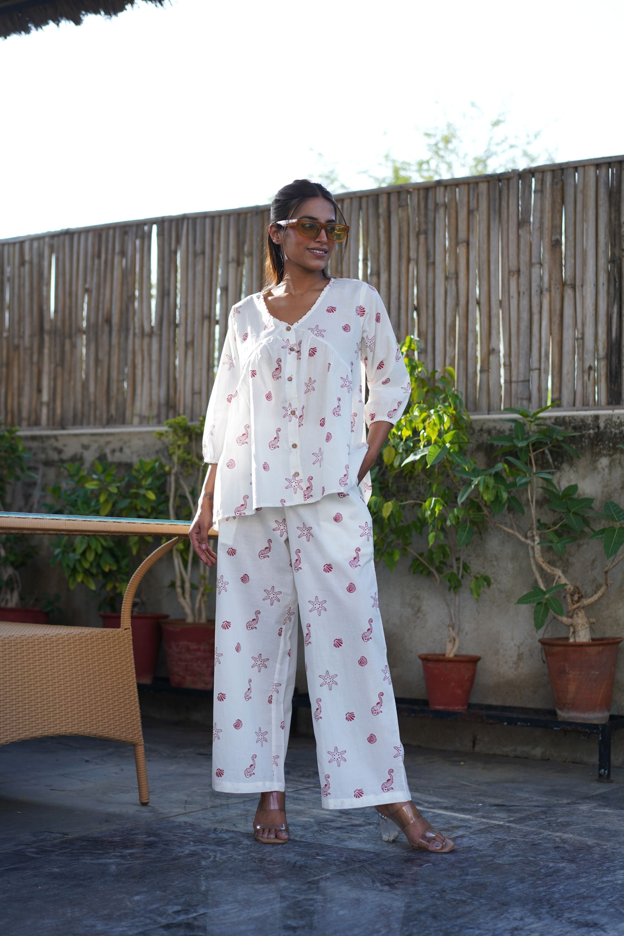 1)Set of 2 white cotton top and pant with crimson handblock printed sea motifs