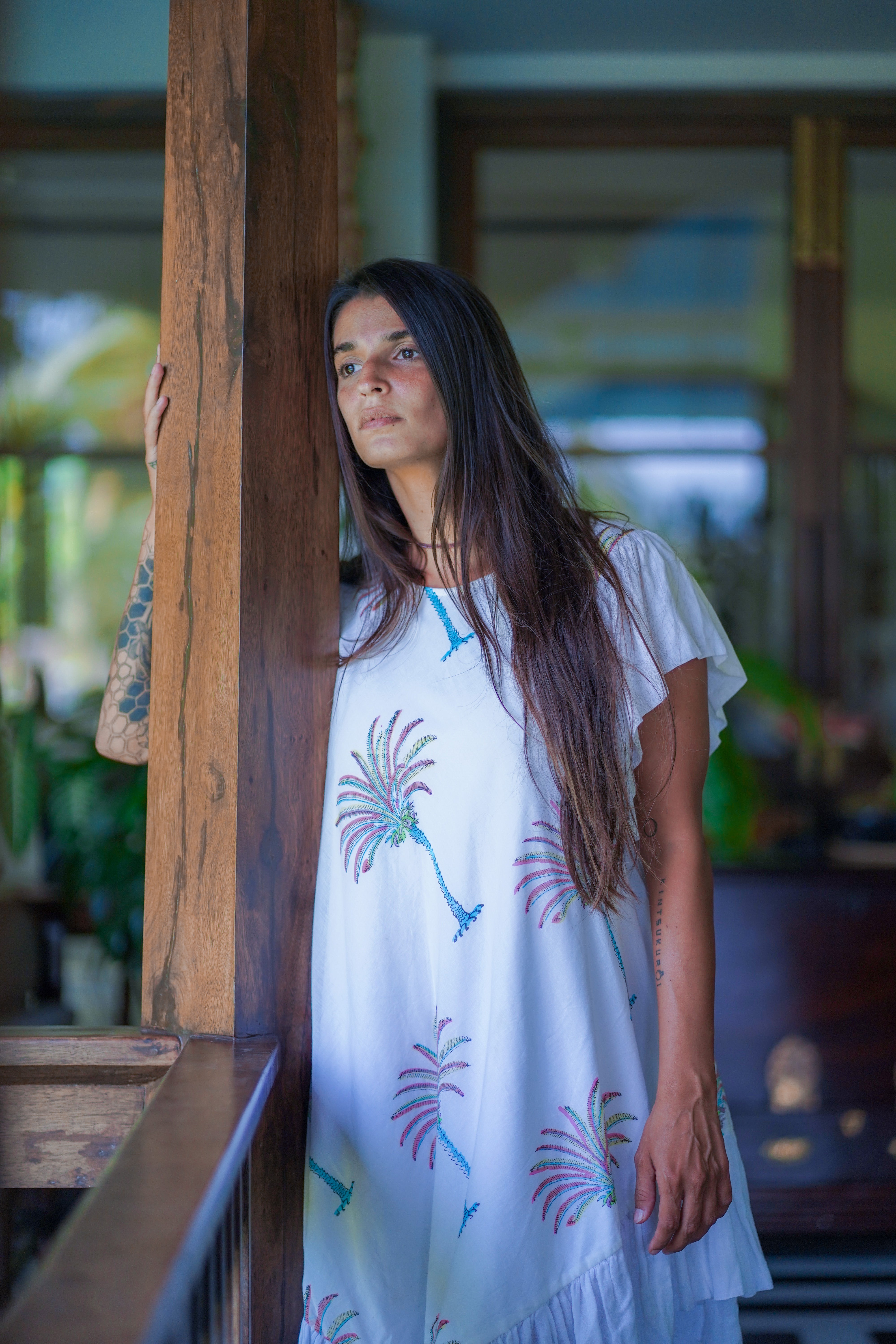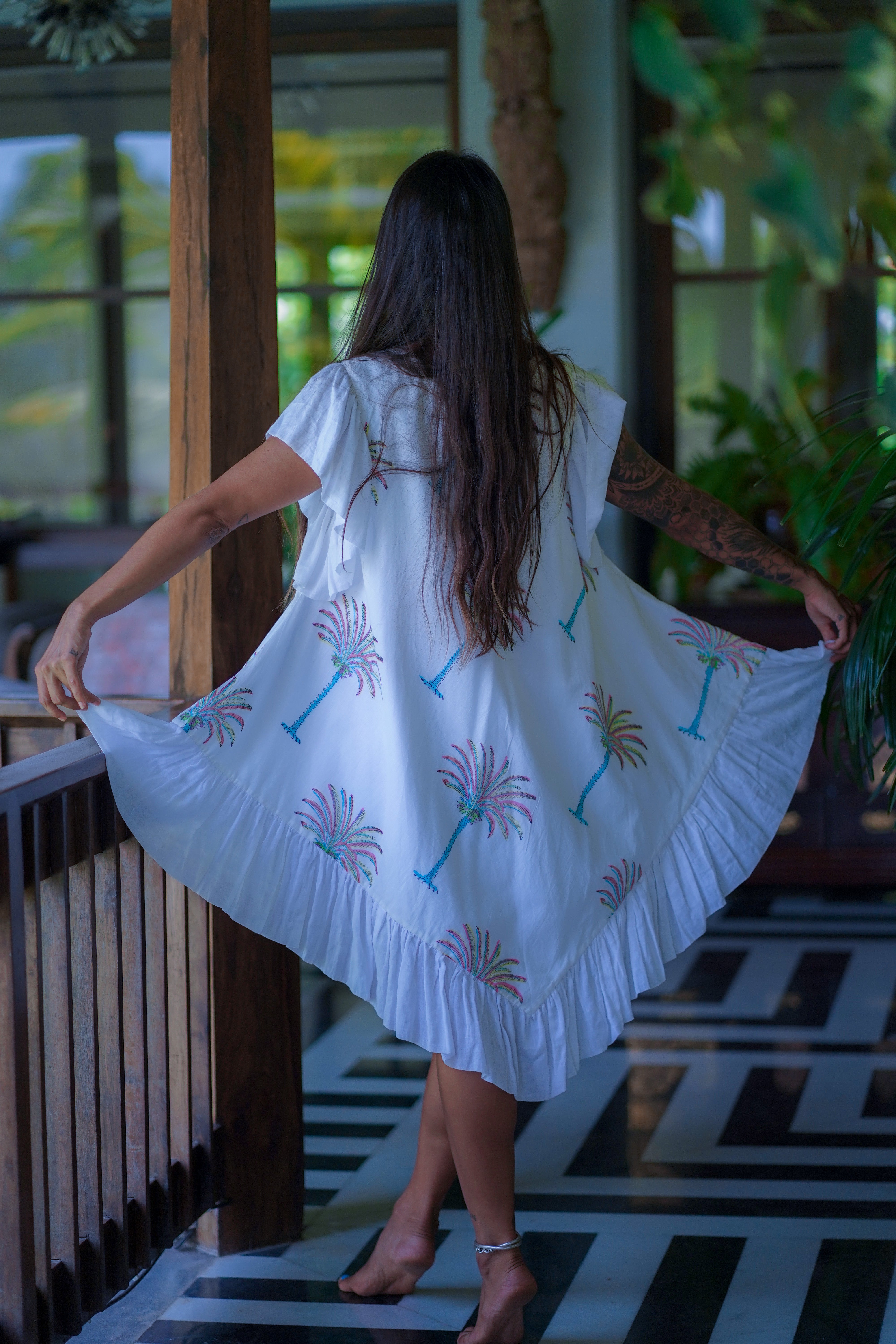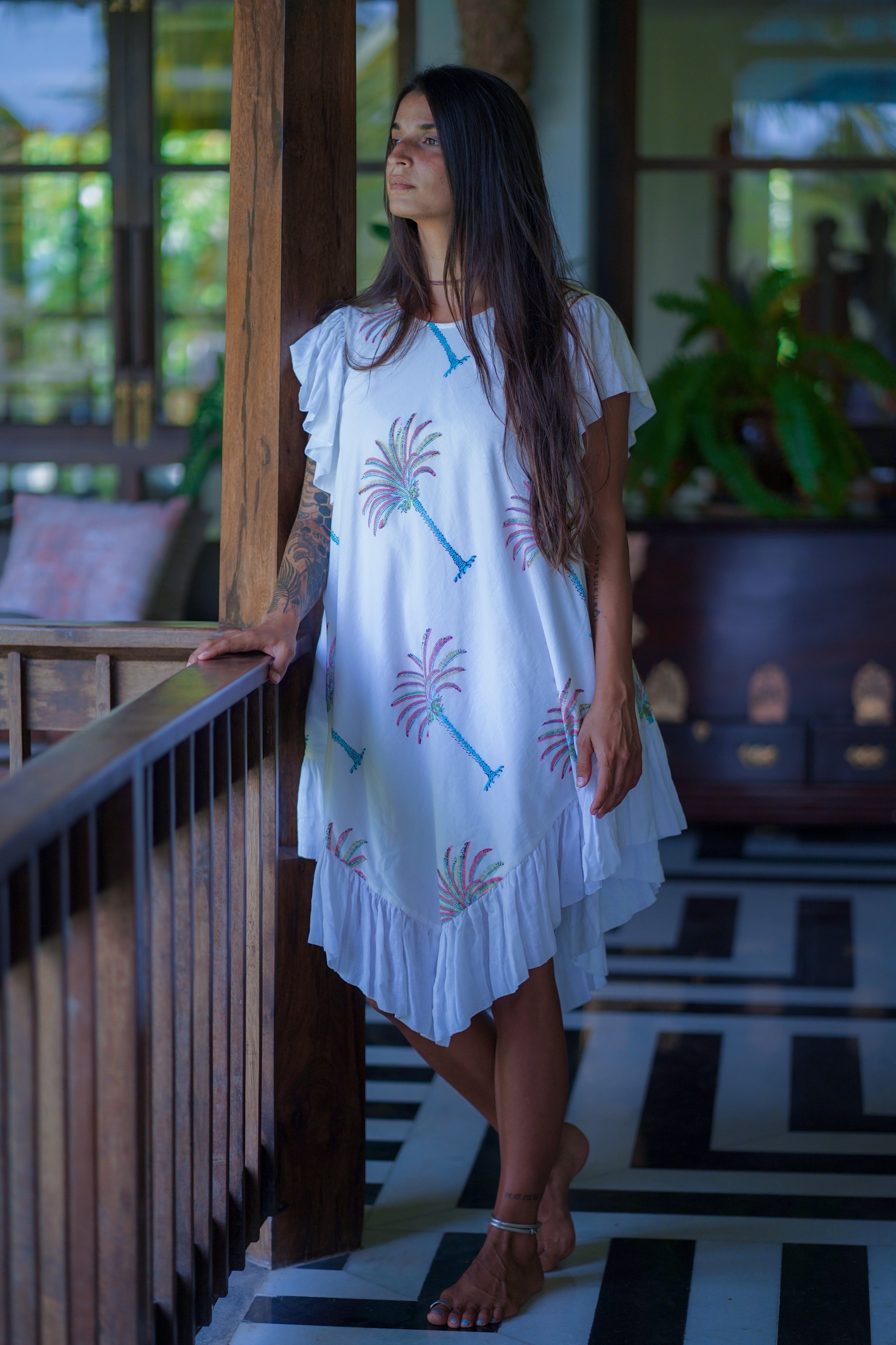 Elevate your style with this palm tree-print dress, a chic and tropical wardrobe essential.