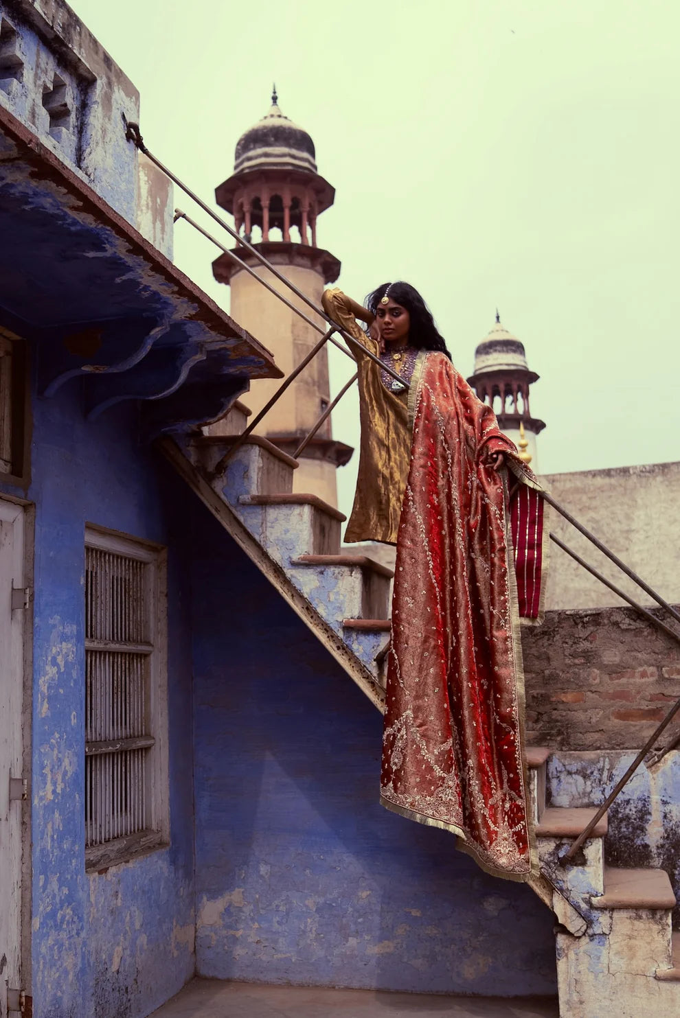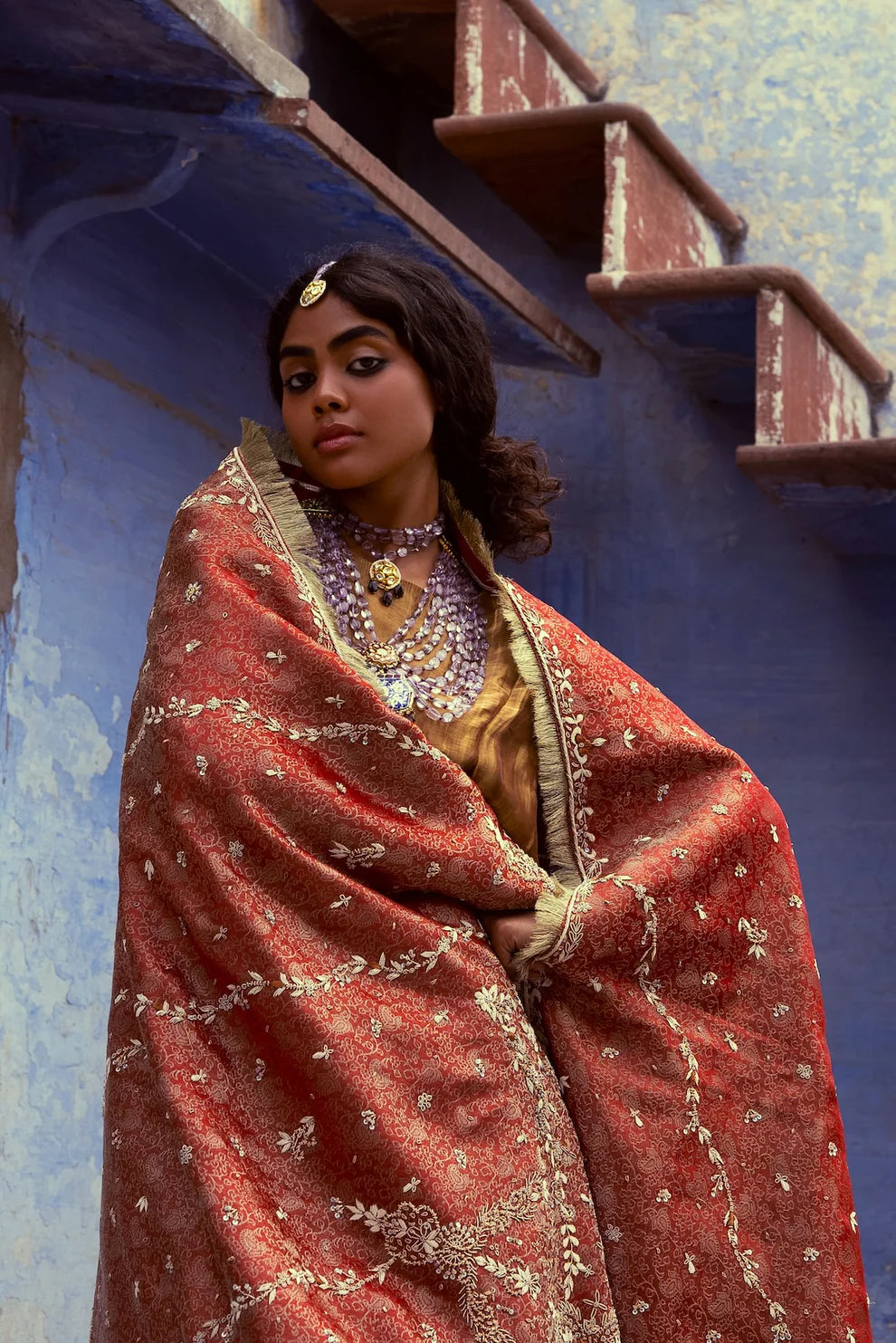 Rust silk tissue dupatta with heavy zardosi work lined with matching gota striped santoon lining, finished with kiran.