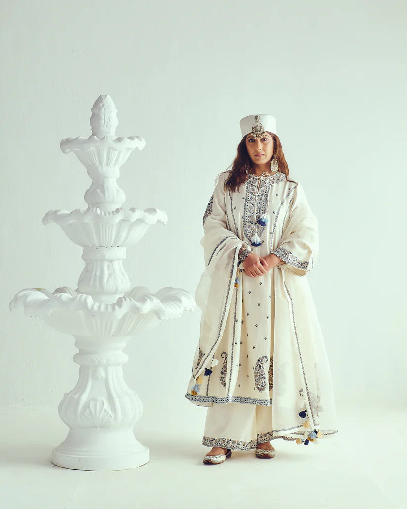 Chanderi Handloom Phiran Anarkali paired with Flare Pants and Dupatta. Featuring Intricate Multicolour Resham Embroidery with Hand Highlights of Sequin and Beads.