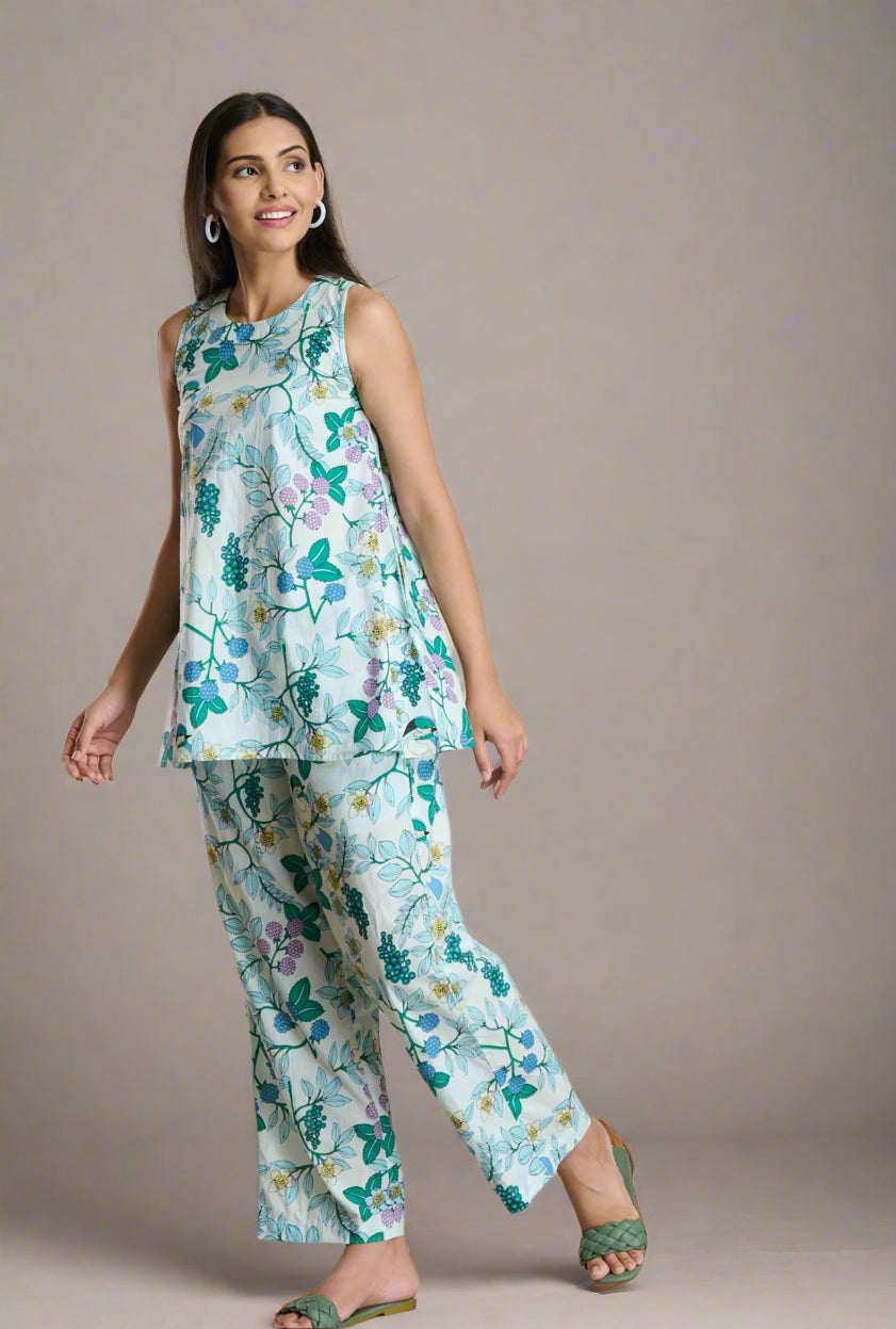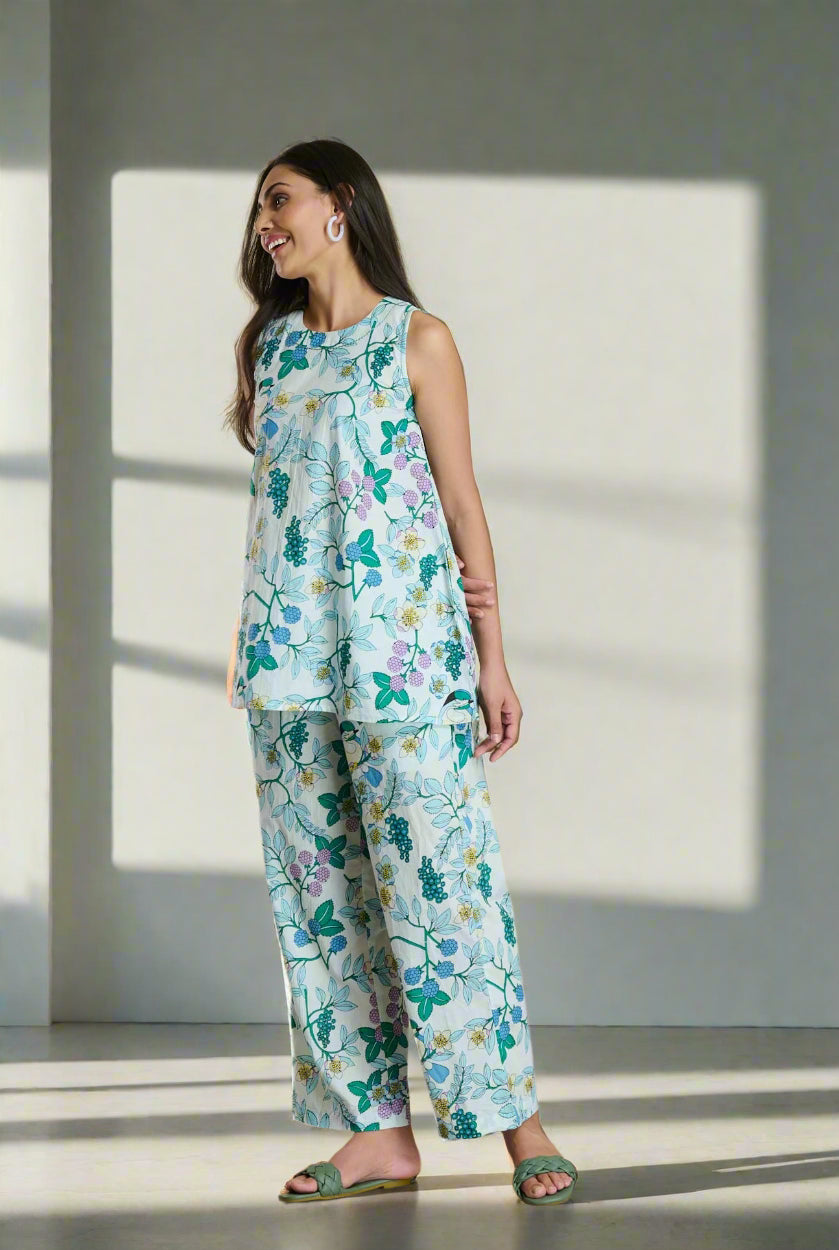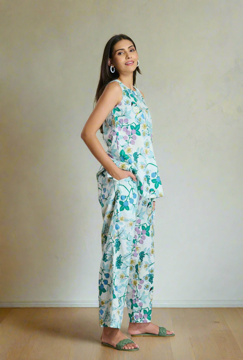 Don't miss out on adding this must-have summer wardrobe set to your collection! Complete with a stylish long top and matching pants, all featuring a stunning grape and floral print on a bright white background. Made from high-quality cotton, this ensemble offers both elegance and comfort, perfect for a day in the sun or a tropical getaway. Show off your fashion sense with this summery outfit that perfectly combines chicness and ease.