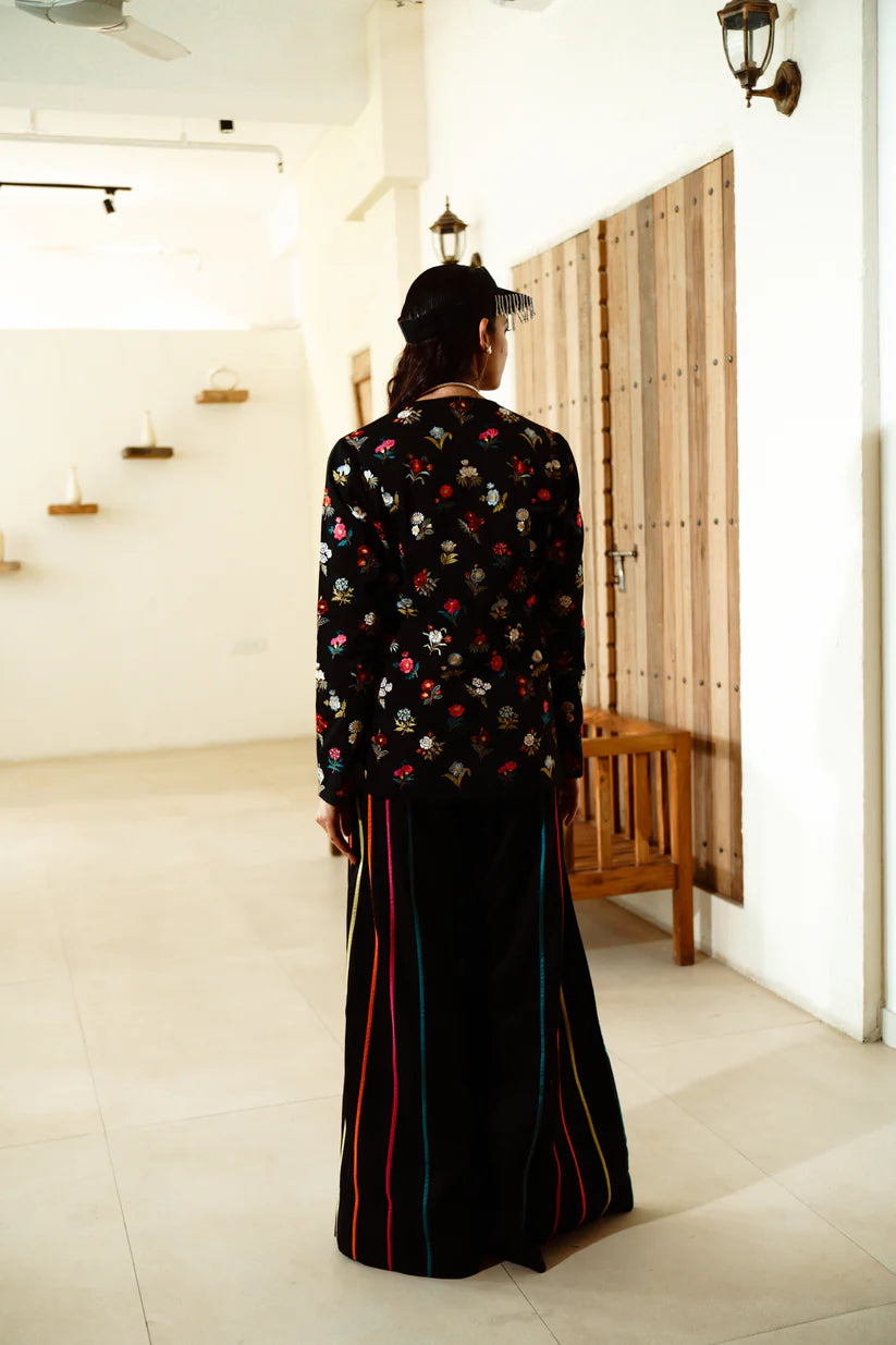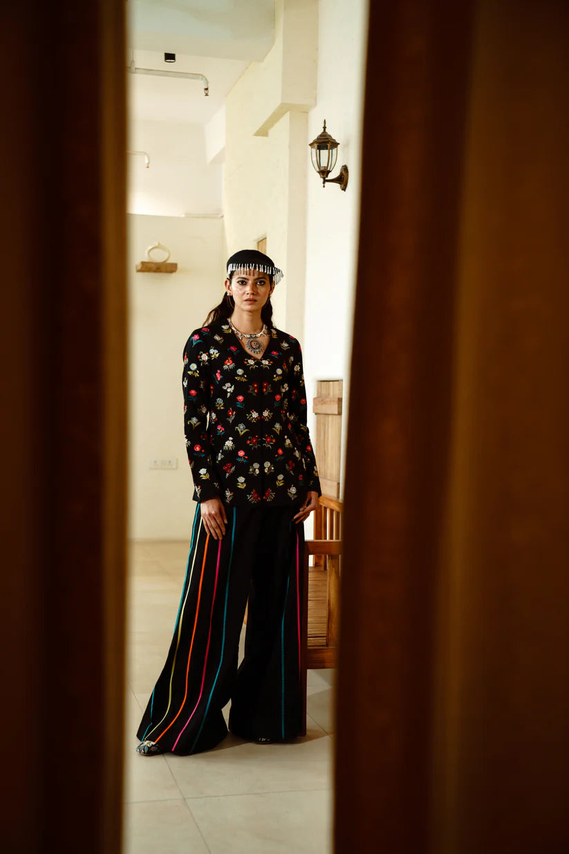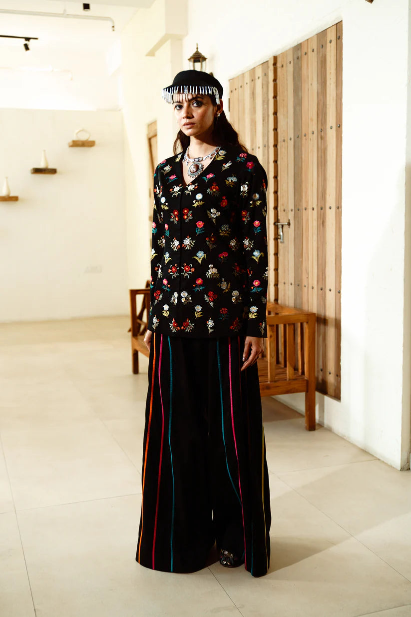 Cotton Silk Jacket paired with Flare Pants. Featuring Intricate Multicolour Resham Embroidery with Contrast Stripes.
