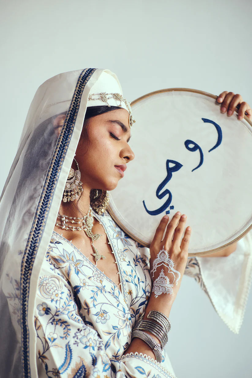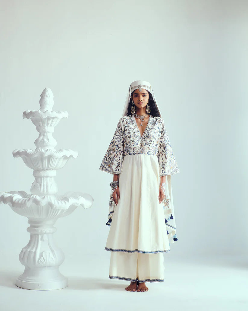 Chanderi Handloom Anarkali paired with Flare Pants and Dupatta. Featuring Intricate Multicolour Resham Embroidery with Hand Highlights of Sequin and Beads with Loop Detailing.