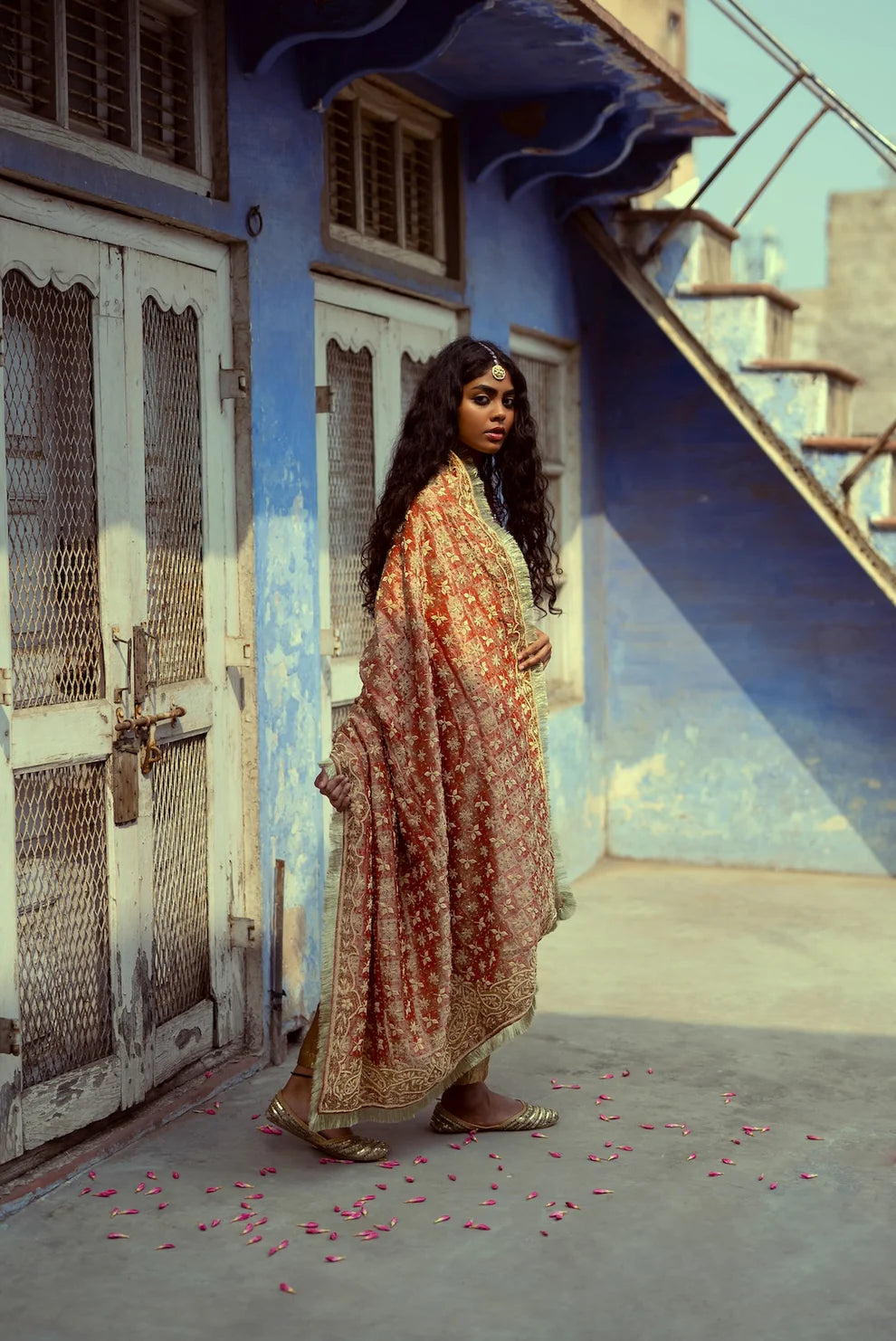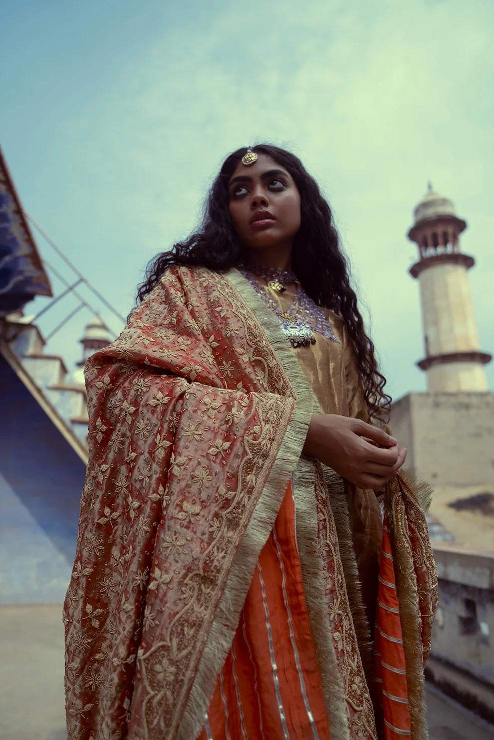 Orange silk tissue dupatta with heavy zardosi work lined with matching gota striped santoon lining, finished with kiran.