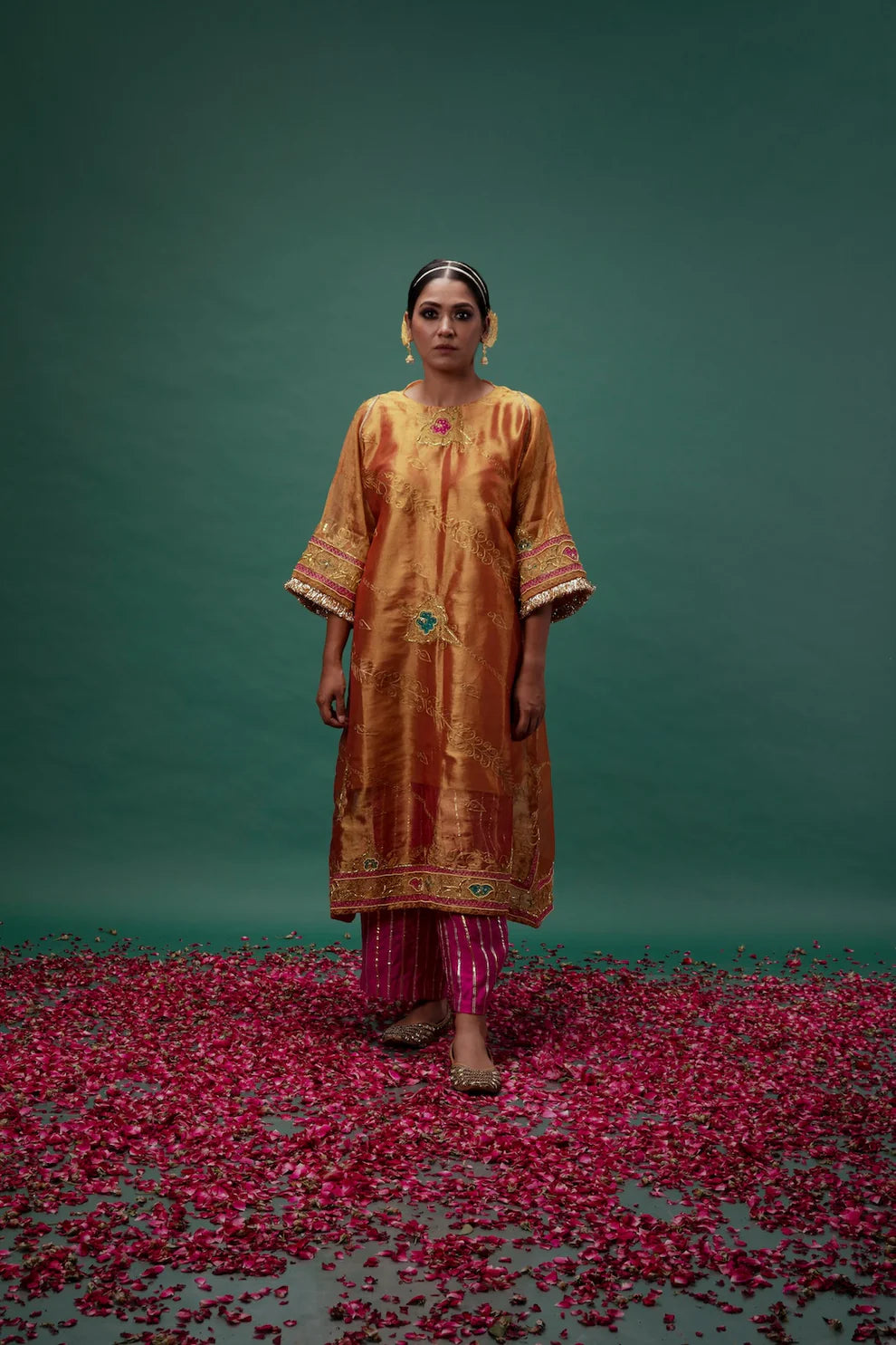Metallic orange hand embroidered choga adorned with applique and zari work, Paired with rani chanderi gota striped pants.