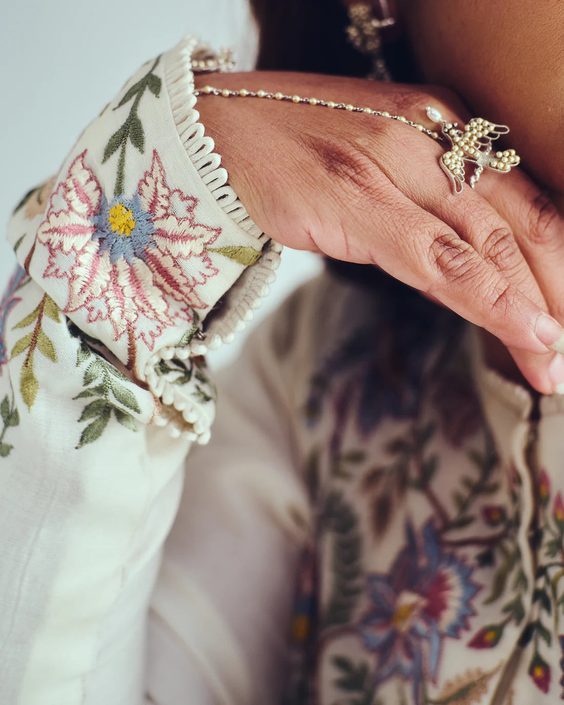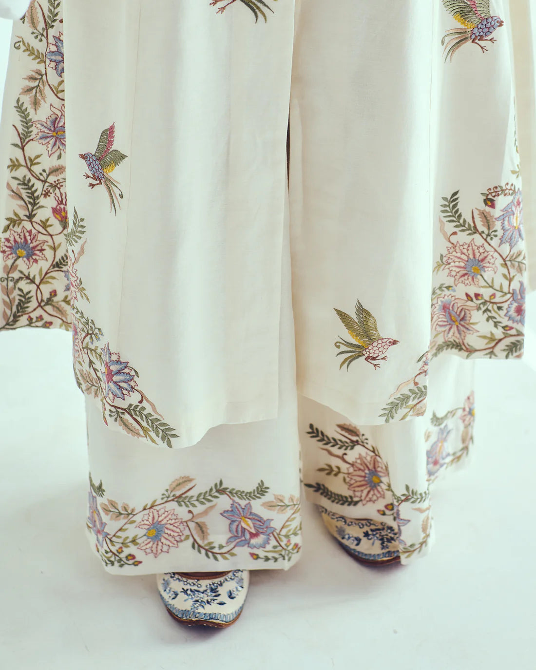 Chanderi Handloom Jacket Anarkali paired with Flare Pants and Dupatta. Featuring Intricate Multicolour Resham Embroidery with Loop Detailing.