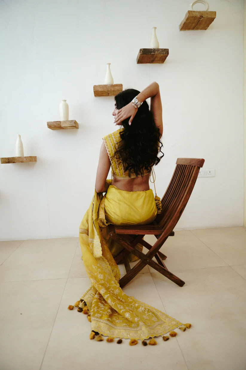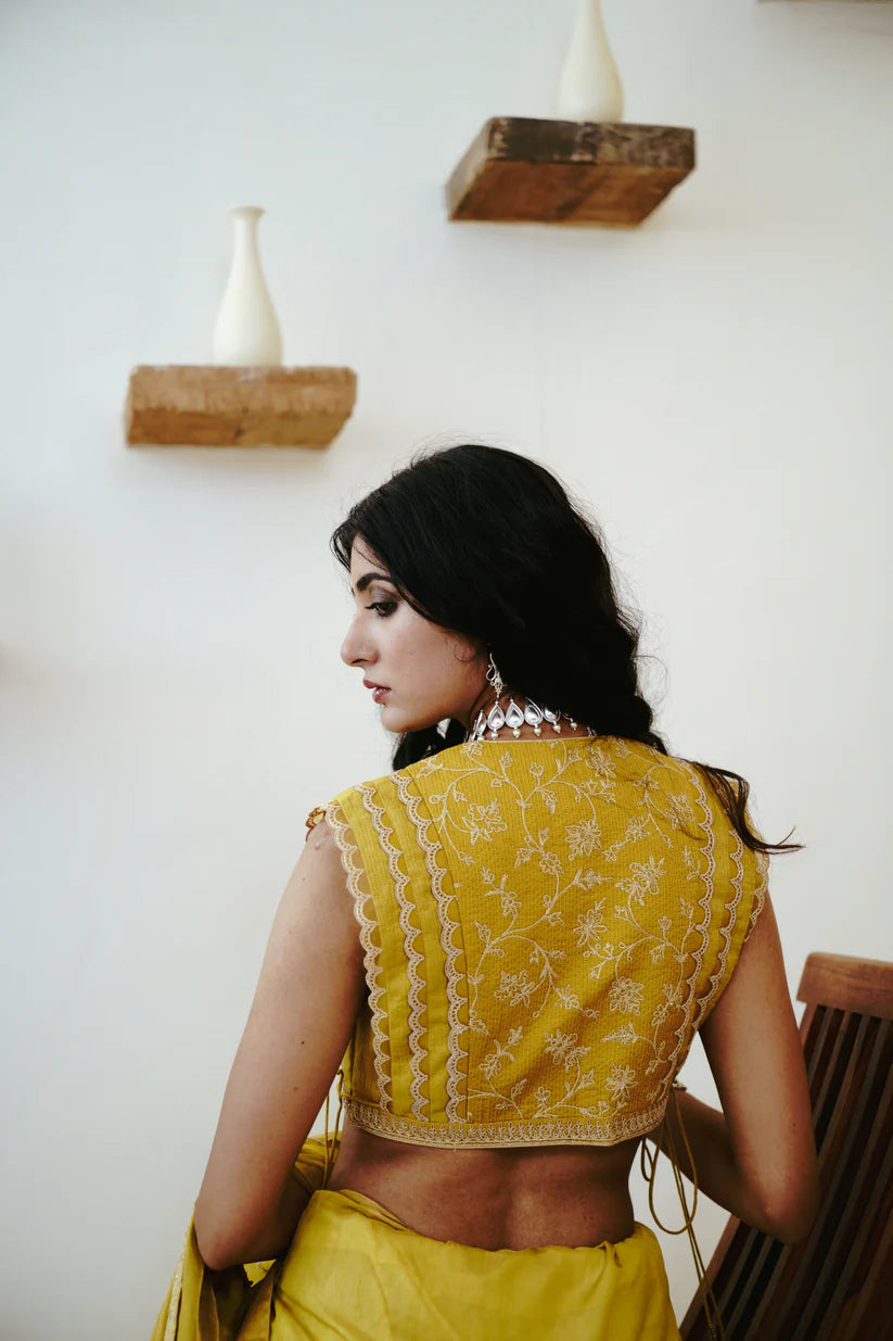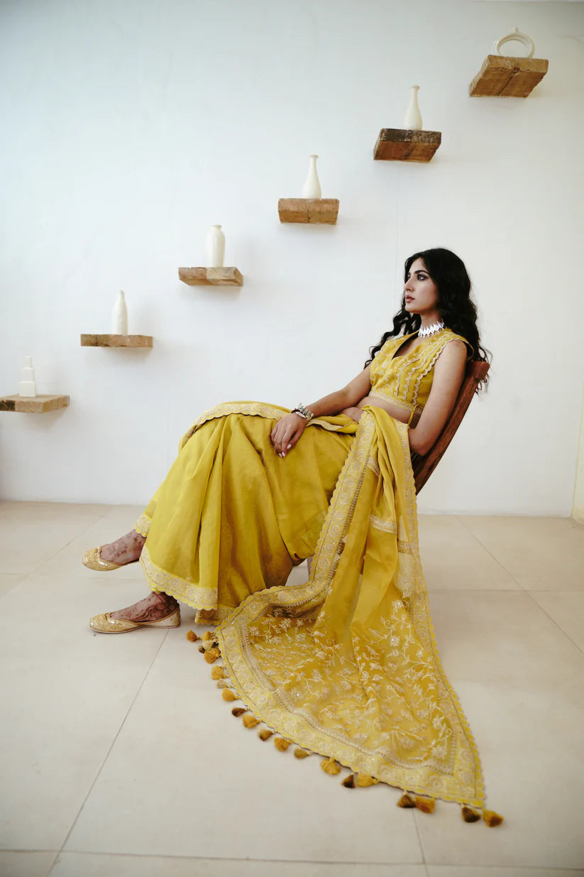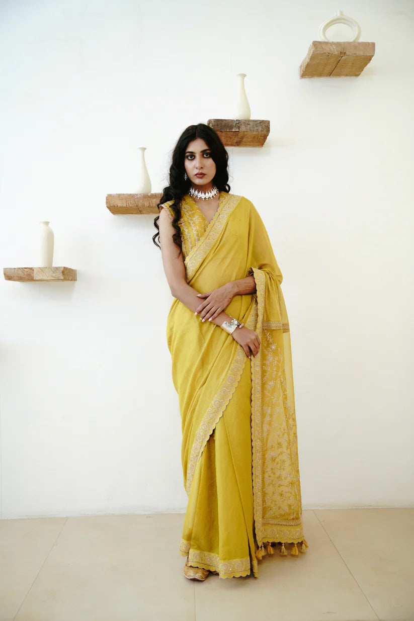 Handwoven Tissue Saree paired with stitched Blouse. Featuring Intricate Dori Marodi Embroidery with Hand Highlights of Sequin, Cut Dana, and Beads.
