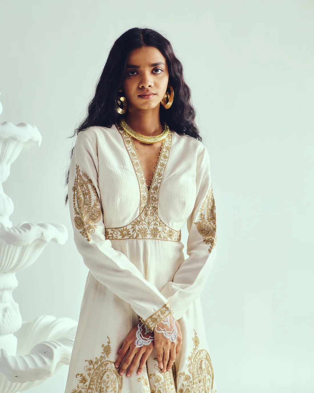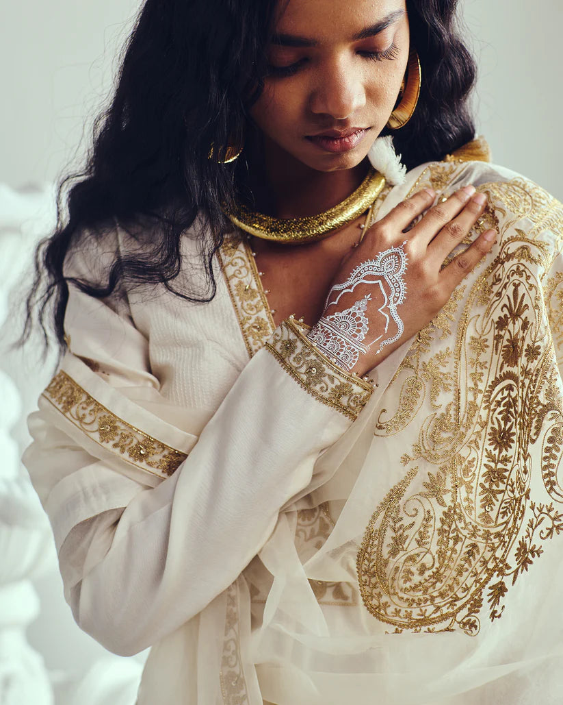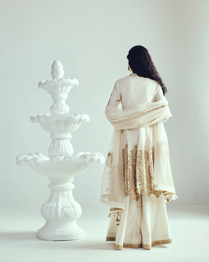 Chanderi Handloom Anarkali paired with Sharara and Dupatta. Featuring Intricate Aari Embroidery with Hand Highlights of Sequin, Cut Dana, and Beads.
