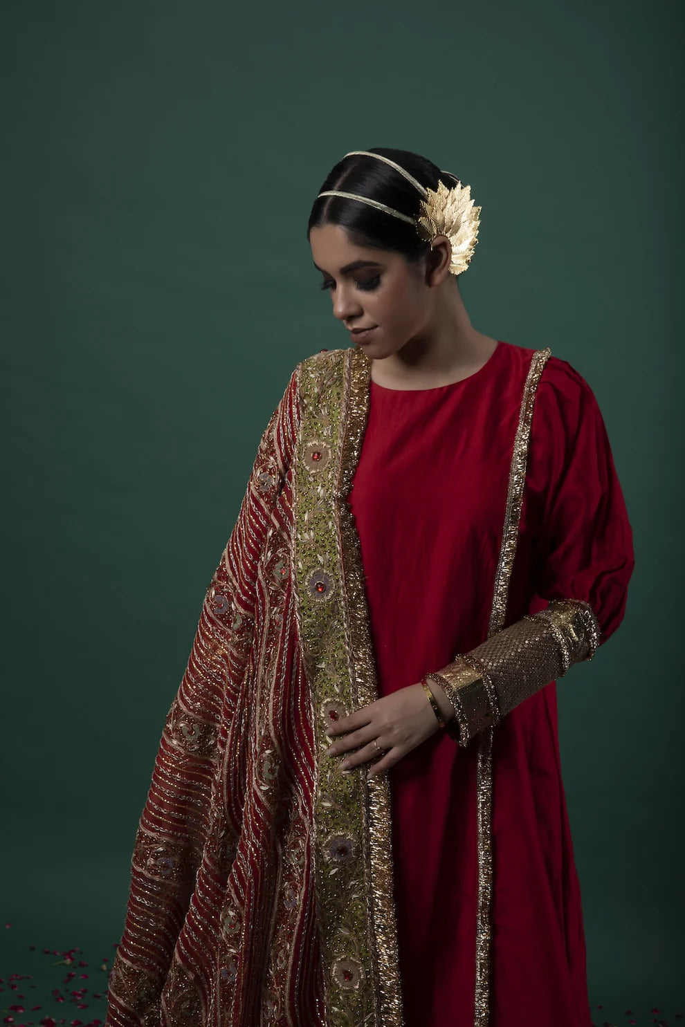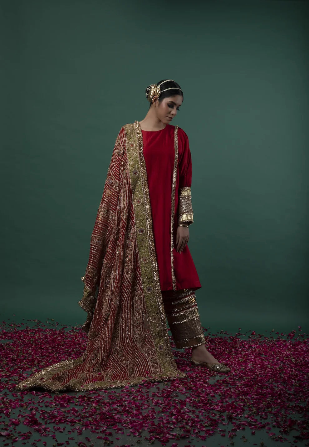 Red chiffon heavy zardosi dupatta lined with matching gota striped santoon lining.