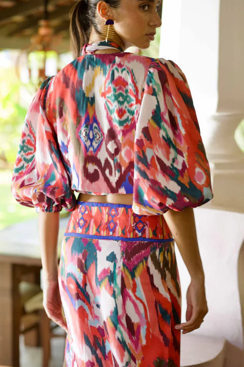 A touch of drama, a hint of play—the Santos Puff Jacket is a cropped layer that brings structure and softness into perfect harmony. With billowing puff sleeves and a flattering cropped silhouette, it’s finished with delicate tie-up strings adorned with beaded tassels that sway with charm. Fully lined for comfort, this jacket pairs effortlessly with the Santos Crop Top for a coordinated look that’s equal parts bold and beautiful. Whether thrown over sunlit separates or styled as a set, it’s a piece that speaks in style.