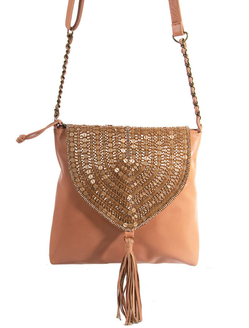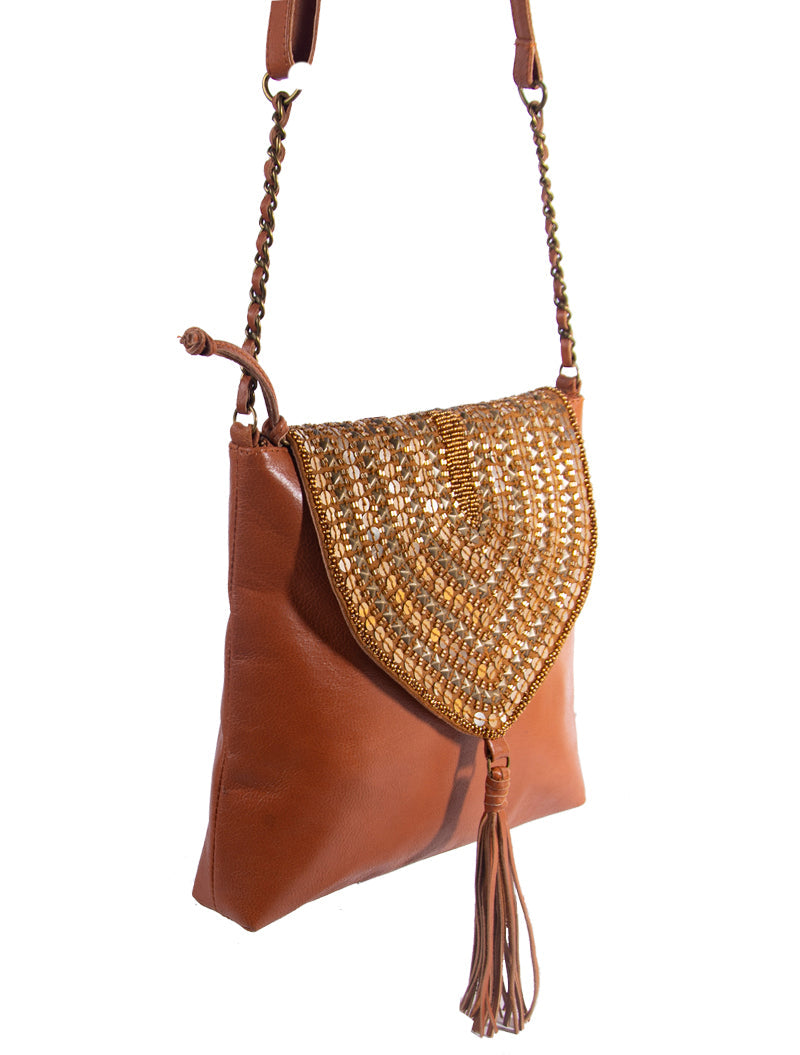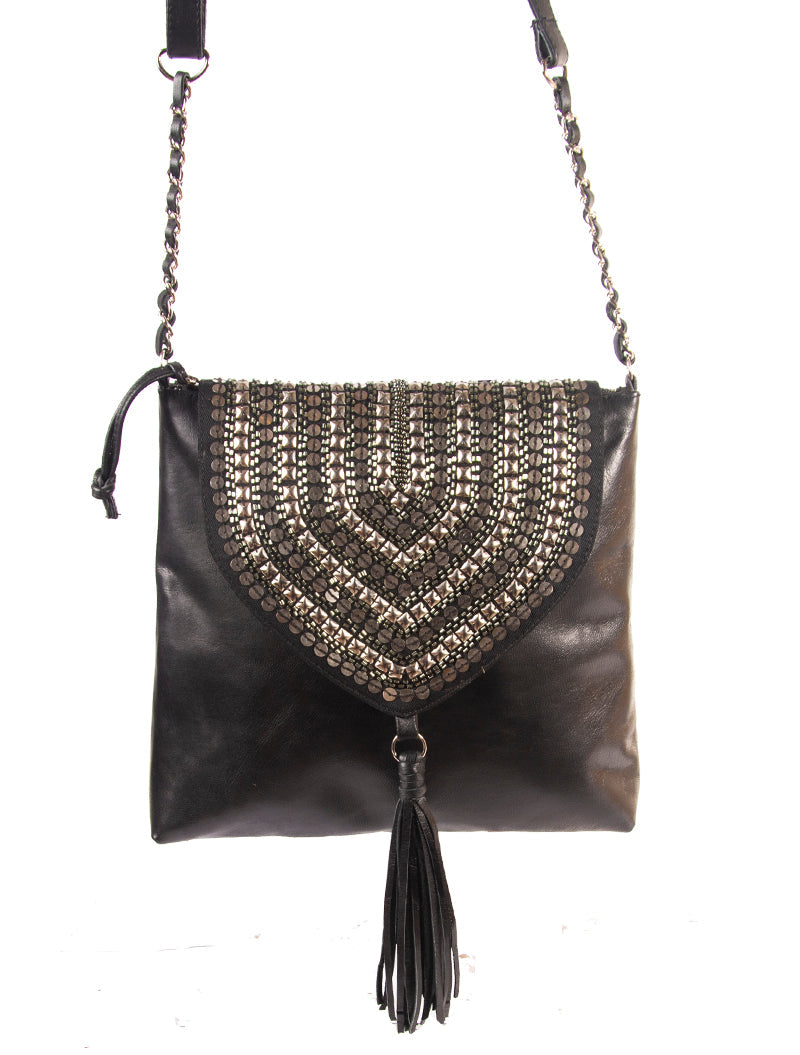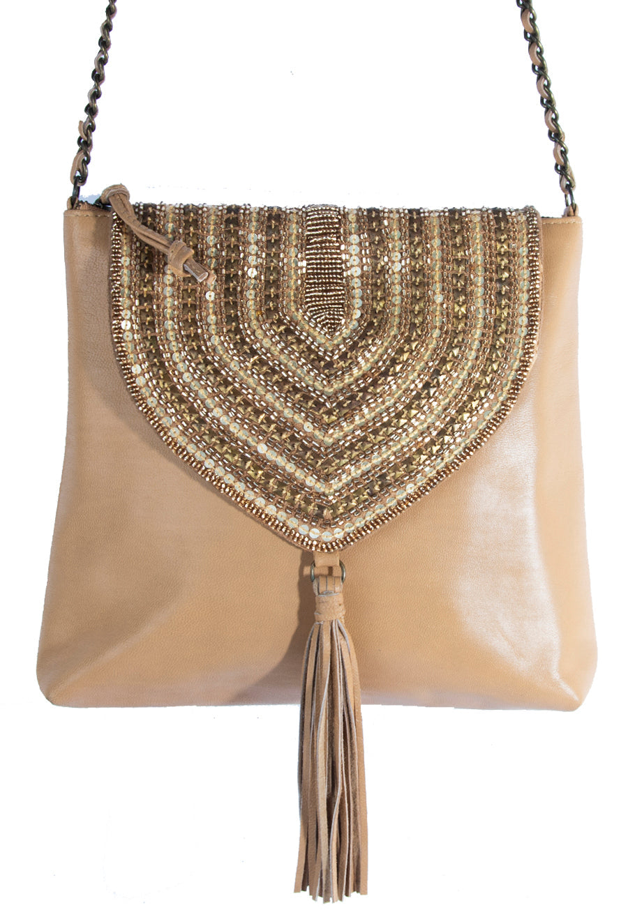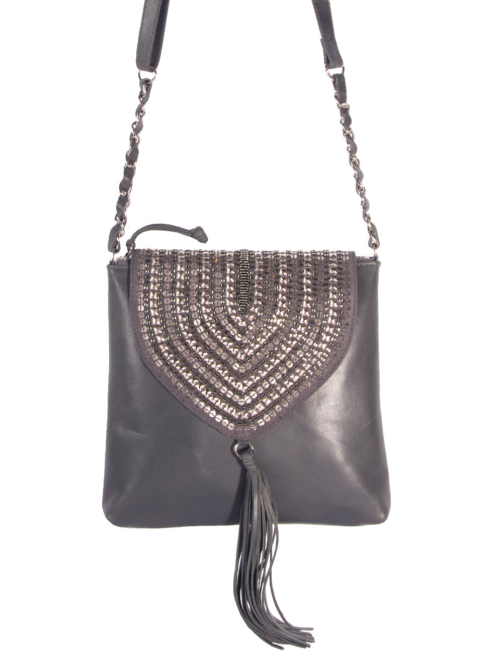 Expertly crafted from high-quality leather, the Victoria Linda crossbody features a unique design with a beaded flap that doubles as a secure closure. The fringe decoration adds a touch of chicness, while the leather chain allows for versatile wear. Elevate any outfit with this stylish and functional bag.