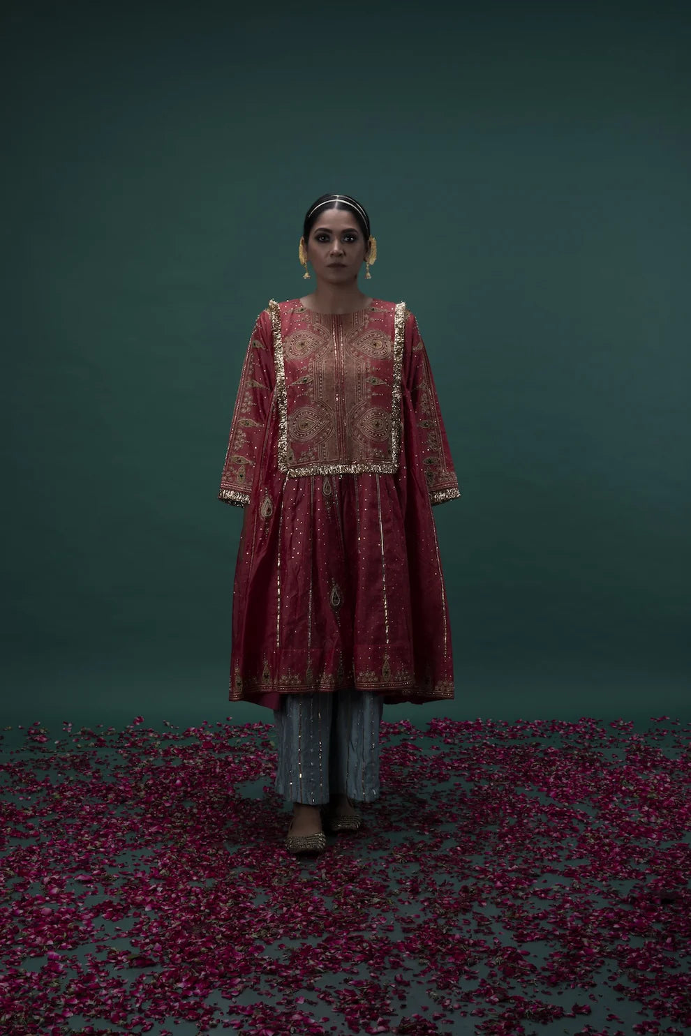 Dull wine long yoke tussar silk kalidar kurta with hand embroidery, paired with ice blue chanderi gota striped pants.