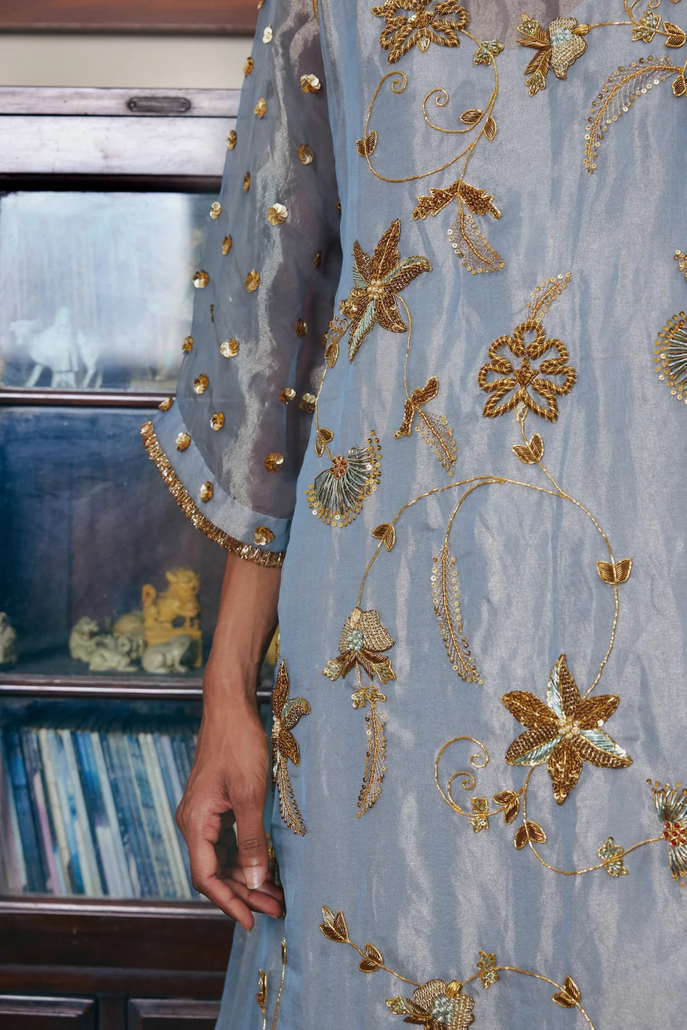 Ice blue silk tissue choga with zardosi work, paired with embroidered matching dupatta and mustard tissue stripe salwar(without lining).