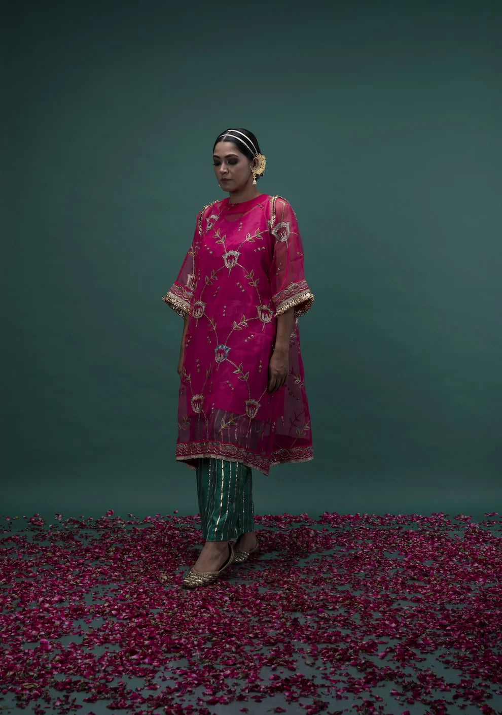 Rani silk organza choga with zari, resham and zardosi embroidery. Paired with green chanderi gota pants.